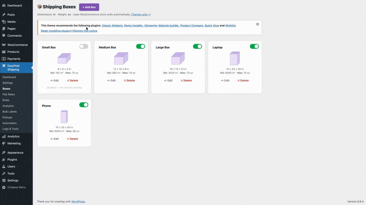 Go to WooCommerce → Settings → Shipping → EasyPost → Packing and add the box sizes you actually use in your warehouse. For each box, enter: